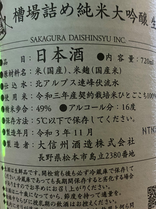 大信州 槽場詰め 純米大吟釀 初しぼり無濾過生原酒